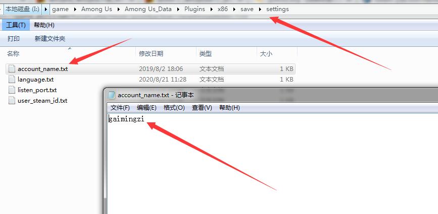 记事本方式打开游戏目录下面的\Among Us_Data\Plugins\x86\save\settings\account_name.txt,改成自己想要的英文名字,保存。