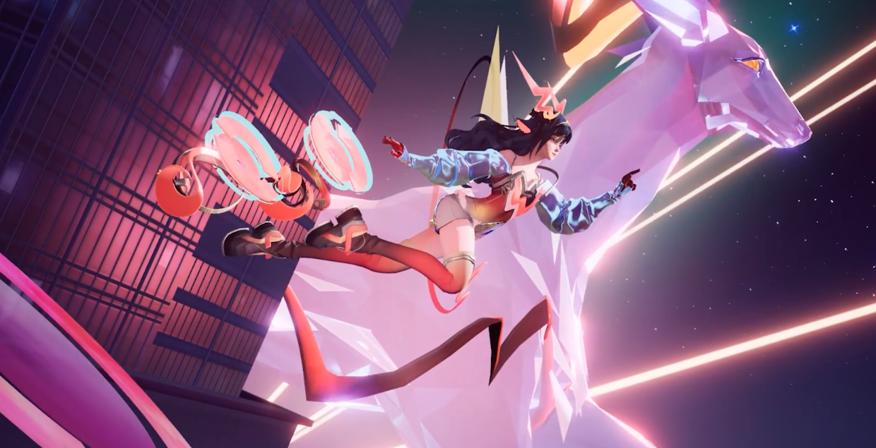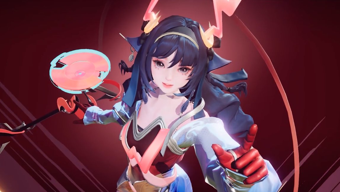 作为闪耀全场的明星DJ,服饰设计方面带有浓厚舞台氛围,蓬松的袖部设计和利落的连体裁剪形成鲜明对比,结合散发光芒的水晶尾巴,展示出瑶甜酷的气质。武器法杖则以DJ操作台为原型。发型设计方面,我们为黑发的瑶设计了编发,增加其俏皮感,鹿角则以红色音波的方式呈现。