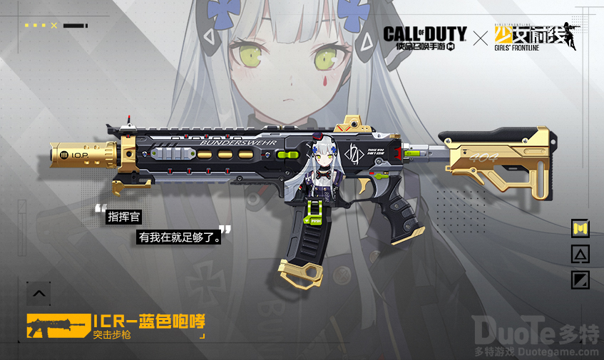 除此之外,“ICR-蓝色咆哮”、“TYPE25-霜晨月”、“SMG5-漆黑公主”、“50GS-威慑印记”、“M1887-猎火终结”、“PP19-狂野奔袭”等经典武器,都将通过“少女前线幸运箱”降临到《使命召唤手游》当中,而“M16-幸运威士忌”及“AGR-灵动之心”也将登场,为玩家们提供了更多元的战斗伙伴。然而更惊喜的来了,玩家只要加入“异界联合行动”并完成指定任务,就可以直接抱走“Kar98k-迷雾皇冠”和“AS VAL-暴击小熊”!