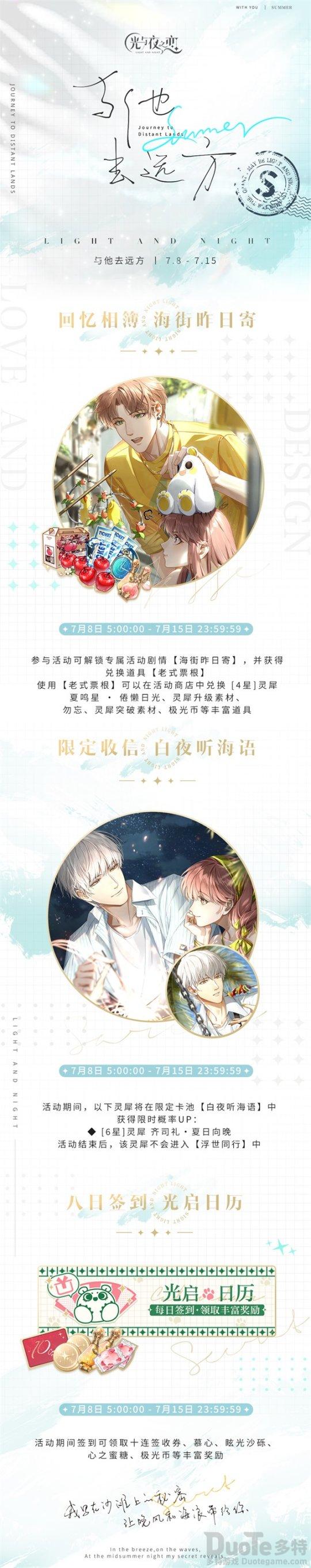 夏日活动“与他去远方”于7月8日正式开启。现在登录游戏,即可参与丰富活动内容: