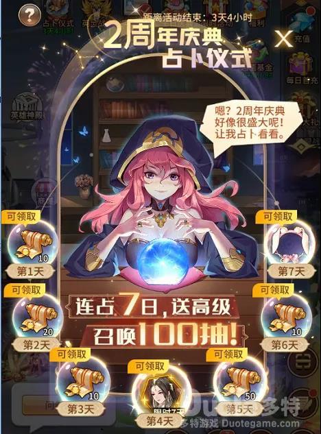 6月24日版本更新后,二周年庆典占卜仪式正式开启!累计登录进行占卜便可免费获取100抽高级召唤卷,体验抽到手软的感觉!更有新英雄女娲试用和周年限定头像框等你来领!