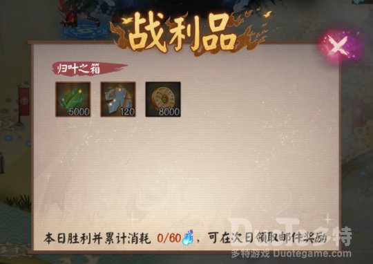 阴阳师们挑战「归叶之箱」所获得的部分奖励将会存放于「战利品」中。本日胜利并累计消耗60点「寻迹火」可在次日领取邮件奖励。