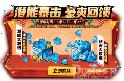 在这次的活动中,玩家累计参与抽取潜能达到指定次数,即可获得潜能抽奖抵用券的返还。进行潜能抽取,有一定几率抽到钻石&潜能材料暴击奖励。每日累计抽取潜能,最高可获得6张潜能抽奖抵用券。而在活动期间累计抽取达到指定次数,不仅能获得潜能抽奖抵用券,还能获得潜能回馈礼品袋!但是小伙伴们注意了,这次的潜能回馈活动将从6月26开始到6月27日结束,仅持续两天哦!