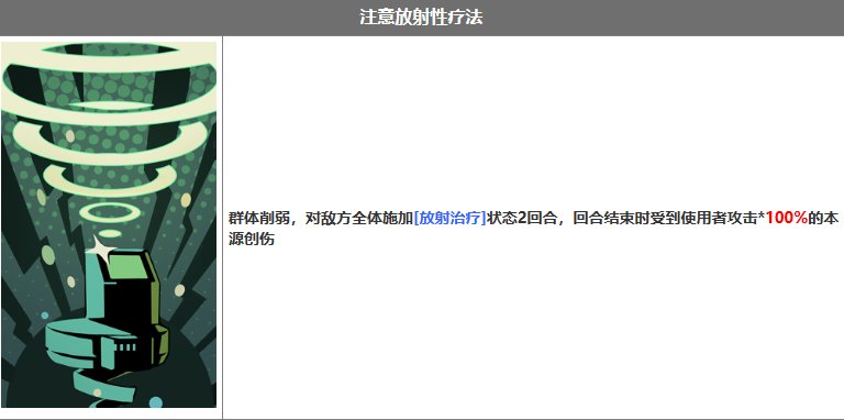 群体削弱,对敌方全体施加[放射治疗]状态2回合,回合结束时受到使用者攻击*100%的本源创伤