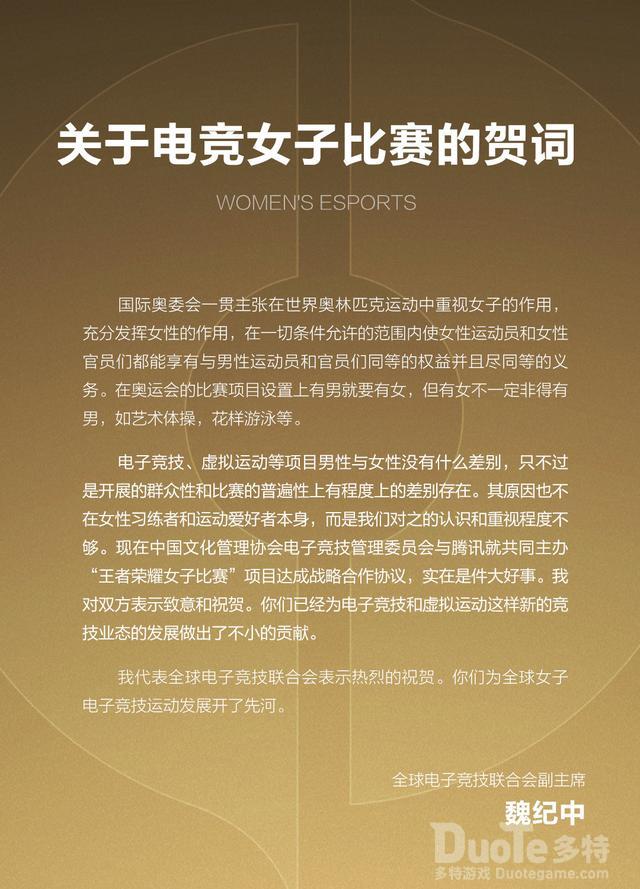目前,《王者荣耀》的女子电竞赛事具体细节还在筹备中,全球电子竞技联合会副主席魏纪中向《王者荣耀》发表了贺词。