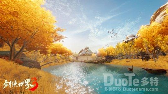 游戏中赏心悦目的美景不仅让人流连忘返,甚至给人以心灵上的治愈。《剑侠世界3》采用PBR等先进技术,让游戏中大到湖光山色,小到一草一木,都展现出一种与众不同的出色表现。秋天的湖面波光粼粼,一只小舟孤独的停靠在岸边,金黄的枫叶漫山遍野,南飞的秋雁结伴划过天边,让人不禁想起了《长相思》中那句知名的“山远天高烟水寒,相思枫叶丹”, 当玩家置身其中,与三五好友一起在枫林旁点燃篝火,共饮一壶美酒,共话一段趣事,实在是别有一番意境所在!