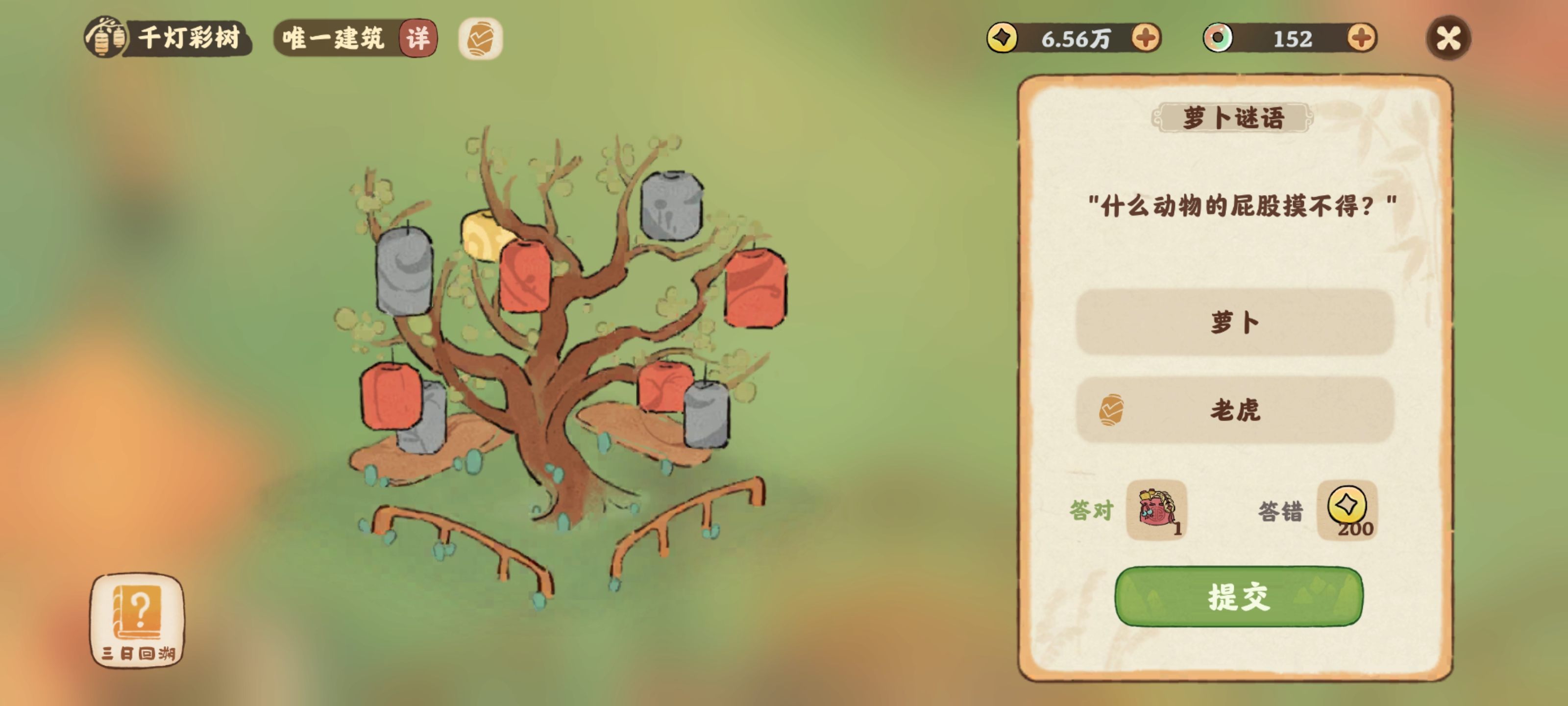 什么动物的屁股摸不得?桃源深处有人家的新建筑千灯彩树可以进行谜题答题,大家知道什么动物的屁股摸不得?下面为大家带来的具体内容,感兴趣的玩家们千万不要错过哦!