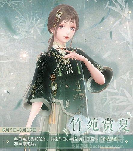 此次游戏更新后,限时福利活动“竹苑赏夏”将于6月5日至6月16日开启。活动期间,玩家每日拜访设计师,完成委托任务,即可获得节庆之章及丰厚奖励。累计指定数量的节庆之章可前往“节日小铺”兑换非凡服饰“竹枝清辞”。