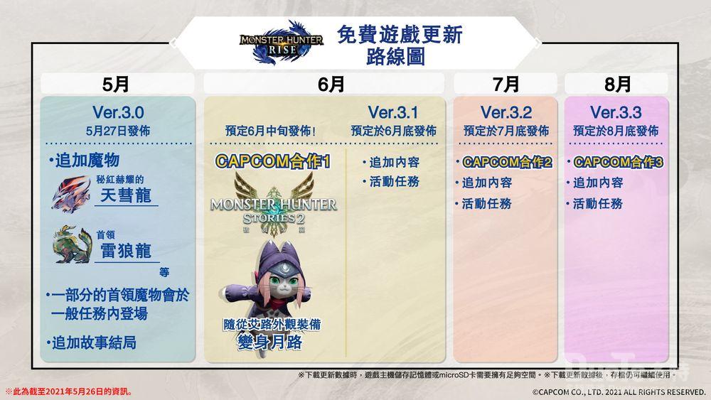 在这次的Ver.3.0更新中,将追加在《魔物猎人XX》中初次登场的主题魔物「天彗龙」的变异体「秘红赫耀的天彗龙」,追加新首领魔物「首领雷狼龙」,追加风神龙与雷神龙两龙相会苏醒的新结局等内容。此外还预定同步推出发售能进一步享受狩猎生活乐趣的新下载内容,同时预告将于6月展开新的联乘活动。
