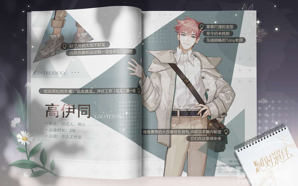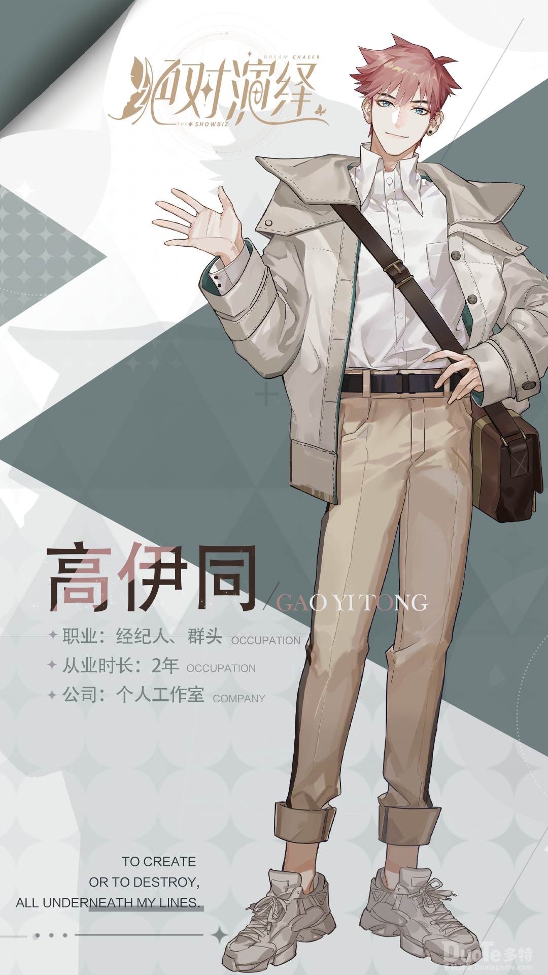 在设定上,他是一个经验成熟的群头,常年游走于各大娱乐公司与剧组,慧眼识珠,给影视行业输送了很多优秀人才。并且,作为和玩家一起成长的“娱乐圈打工人”,他会不遗余力地帮助大家实现自己的成名梦想,是一个帅气又值得信任的靠谱经纪人!