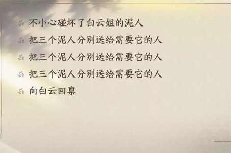 3、玩家需要把三个泥人分别送给【阿任和她的妹妹】、【汪木】、【柳茵茵】。