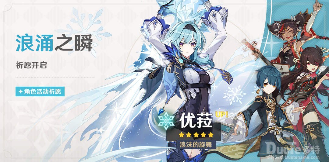 《原神》「浪涌之瞬」活动祈愿已于5月18日18:00开启,限定五星角色「浪沫的旋舞·优菈(冰)」的祈愿获取概率提升。