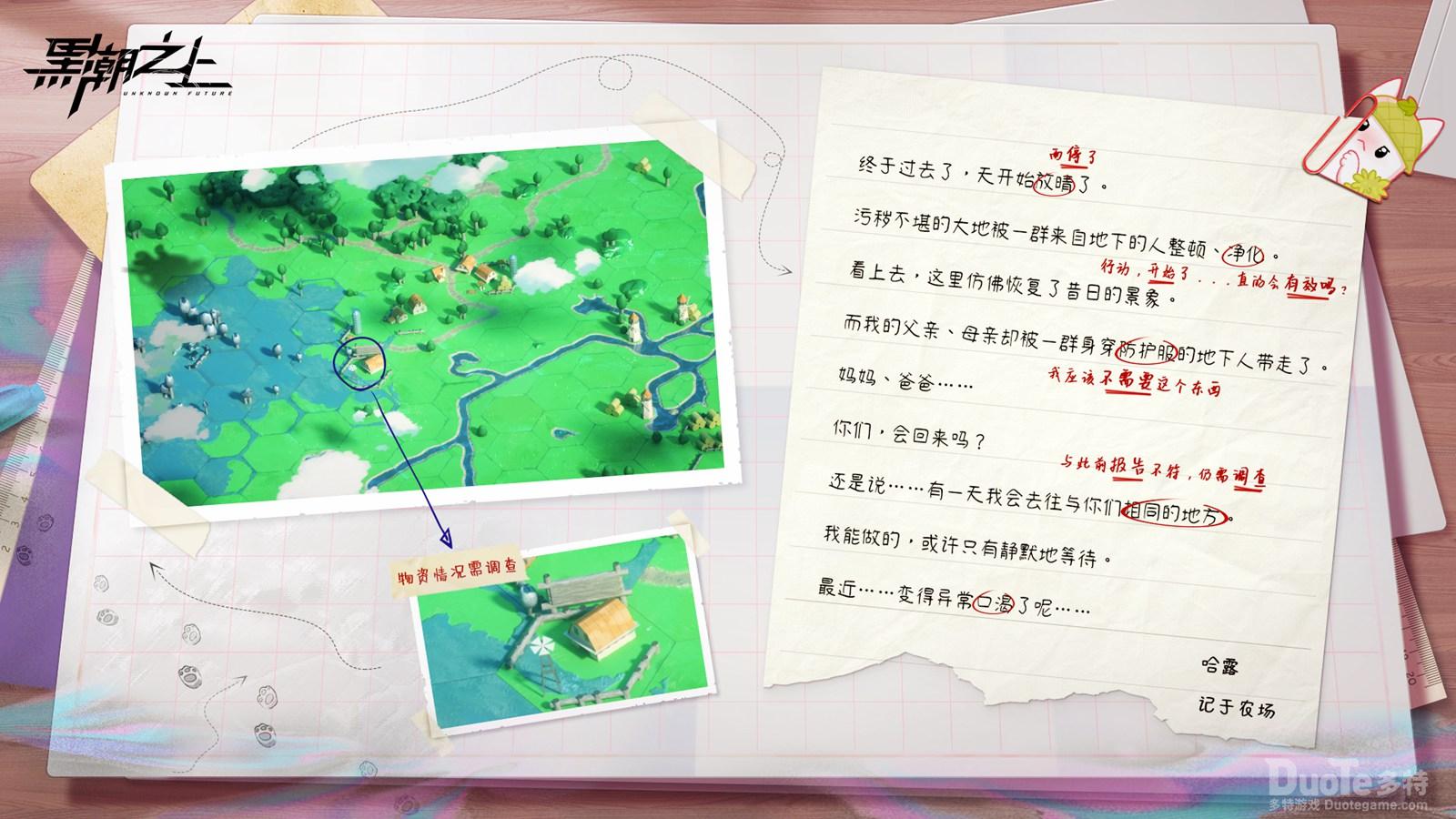 在前期爆料中,《黑潮之上》官方透露,高自由度的沙盘玩法将是新世界的核心内容。从今日公开的首块区域来看,各位接触者密切关注的新世界第一条情报线索已经出现:一张破碎的书信上,记录了一场雨后对「农场」实施「净化」的一幕:父母被一群来自地下、身穿防护服的人带走,而叙述者在静静等待中,感到越来越口渴……农场里究竟发生了什么?这些身穿防护服的人究竟是谁?他们为什么要把人带走?又会去往何方?《黑潮之上》新世界,即将准备各位接触者开启调查!