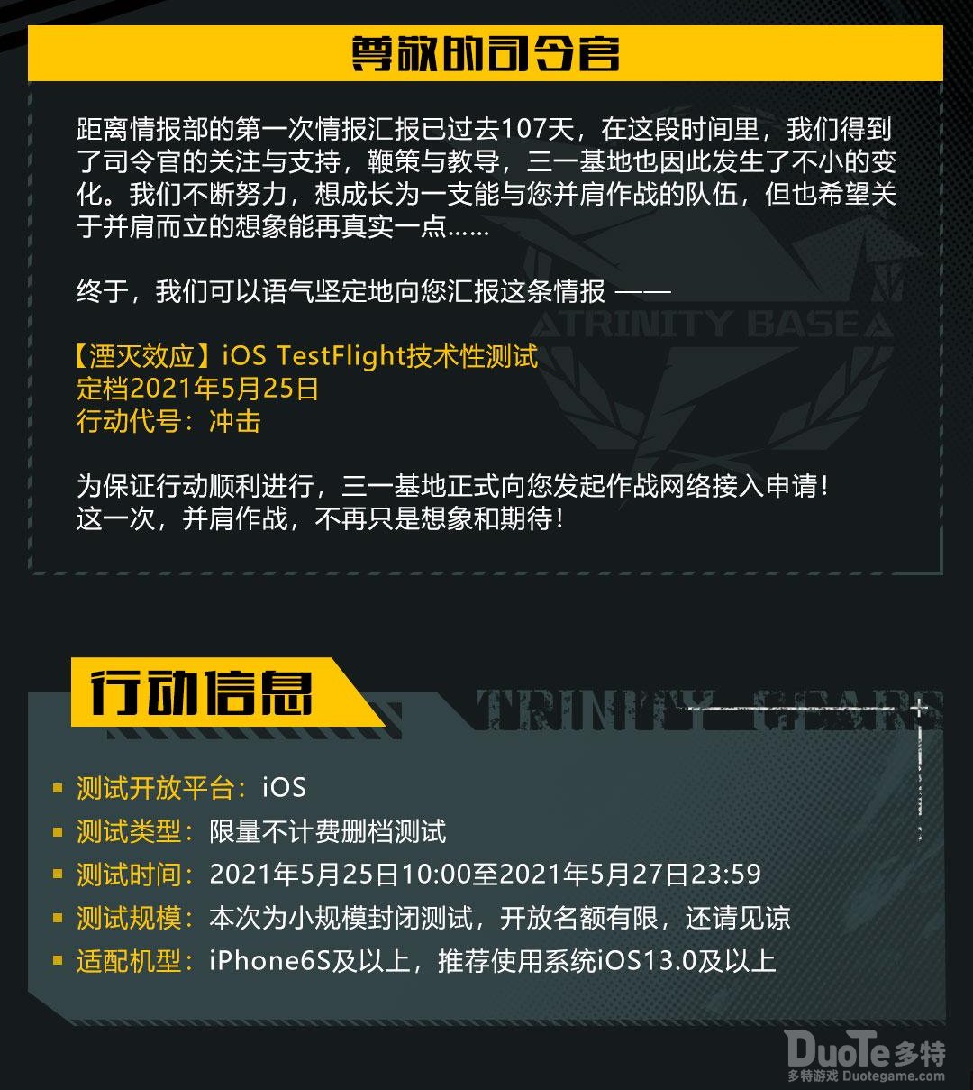 本次测试为 iOS 平台小规模不计费删档内测,玩家需要下载 TestFlight 参与测试。首测的正式上线时间为 5 月 25 日,预期将持续 3 天时间,至5月27日结束。同时,本次为小规模封闭测试,开发名额有限,没有获得资格的司令官也不必灰心,关注官方社区,等待后续的一手情报。