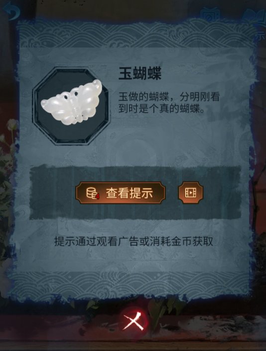 5、点击树下的花丛,获得纸伞,点击飞舞的蝴蝶,获得玉蝴蝶。