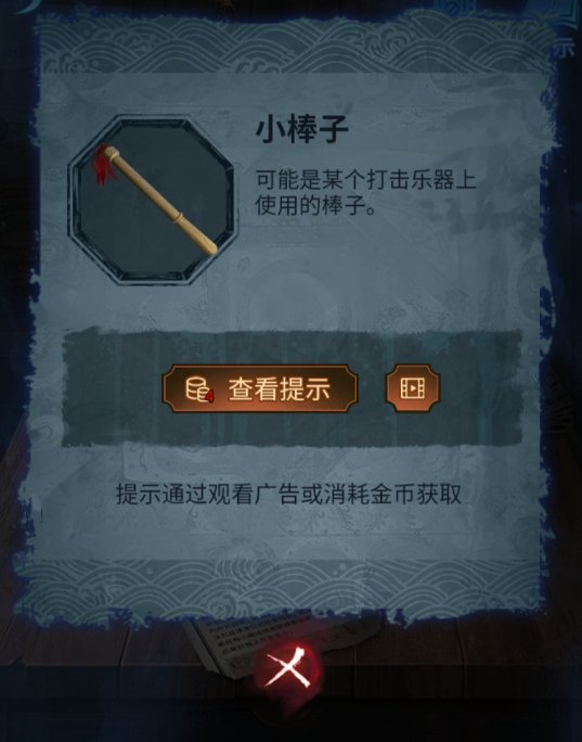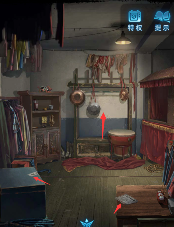15、记录一下报纸上的图案:鼓、锣、梆、鼓、鼓、梆、小锣。点击盖着的幕布,打开是一些乐器,左侧的箱子上贴着封条。