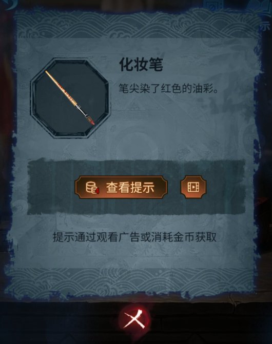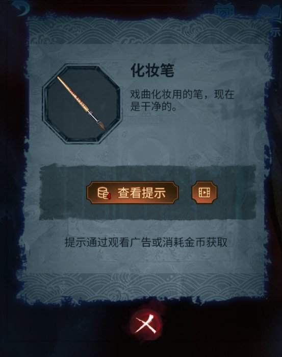 13、打开盒子,获得化妆笔一支。回到道具间,使用化妆笔点击化妆桌上的油彩。然后道具间大门,使用化妆笔开始一笔连线。