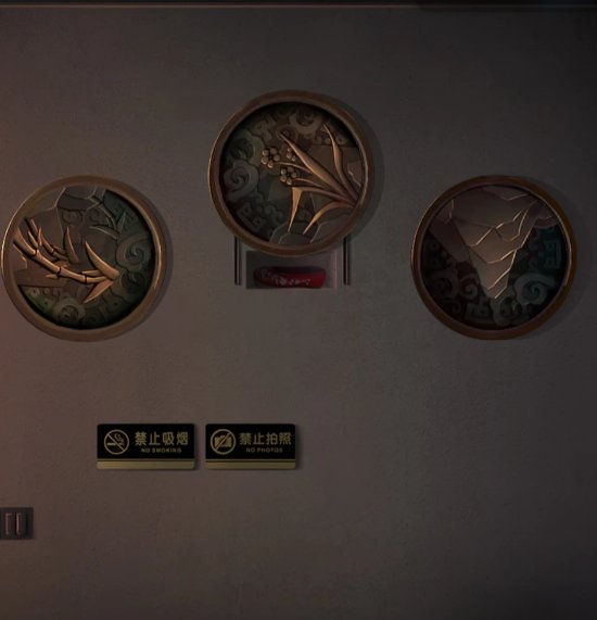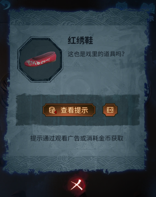 7、点击向后的箭头,点击右侧的墙,这里有机关,将图案转成墓碑上的图案的方位,获得红绣鞋。