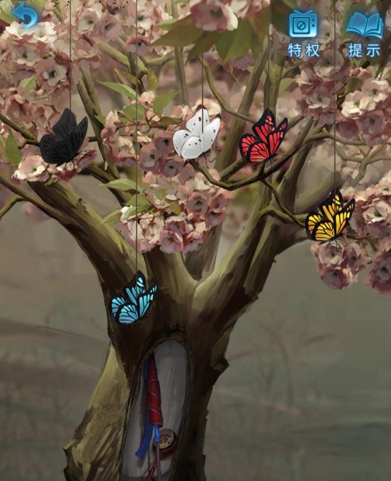 20、进入仓库,点击左侧的小舞台,钟梓萱会降手机拿给你看。来到舞台,点击树,蝴蝶可以相互换位置,将蝴蝶调整如下: