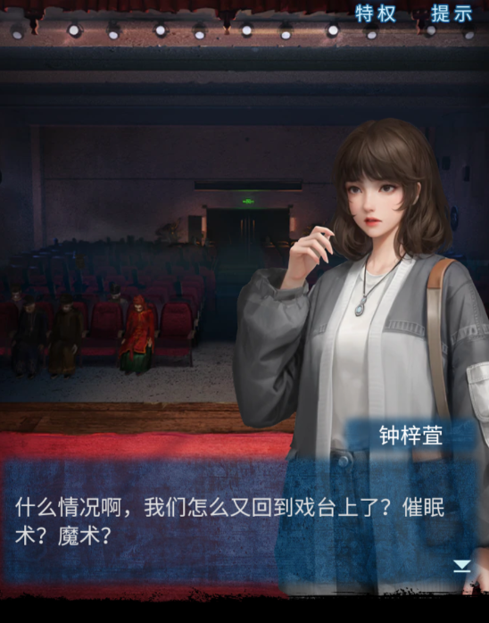 22、喜神娃娃笑了,并给了钥匙。回到前台,使用钥匙离开戏院。最后发现自己回到了戏台之上,第一章完。