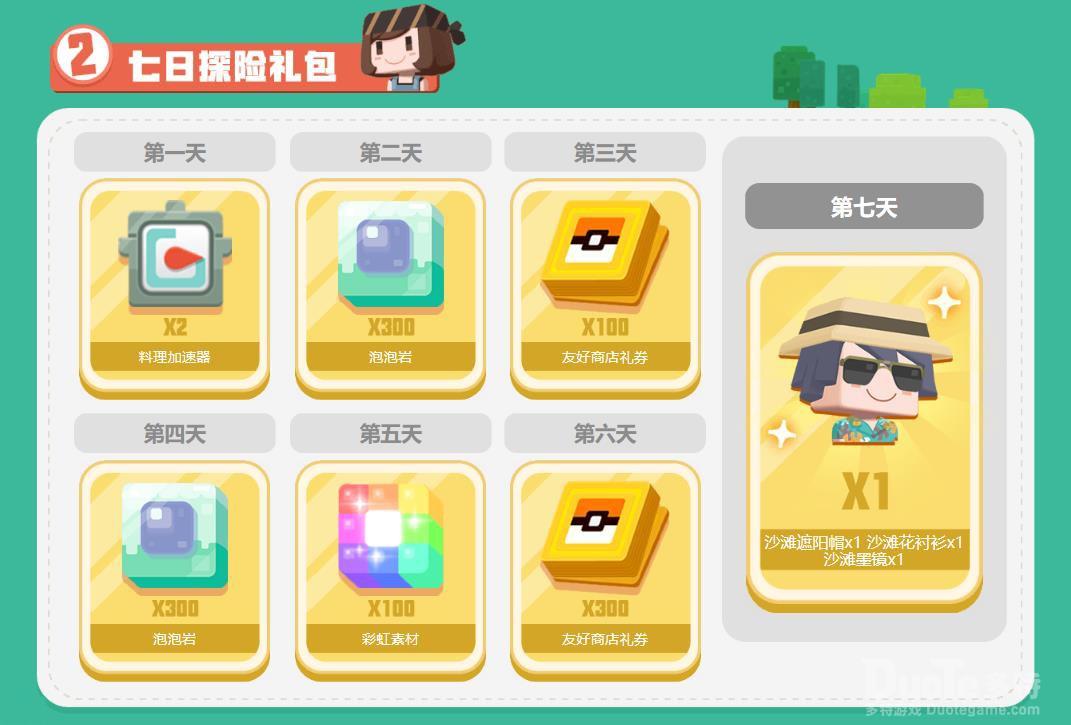 为了庆祝公测开服,在5月13日-5月21日期间,探险家们只需累计签到七天,即可获得限定沙滩套装以及其他丰厚奖励。