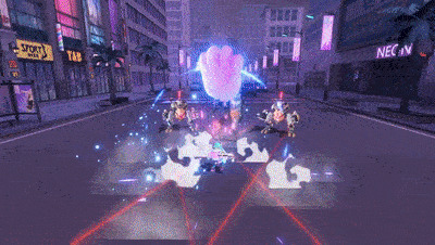 以角色“魔灵”的整体设计为例,她的人设为“热爱电音与舞台的家族萝莉大小姐”,无论是裙摆服饰、双马尾发型、猫猫气球攻击、蹦蹦跳跳的技能动作、战斗中不时会用手比成兔耳卖萌的细节,都突出了她年纪小、性格活泼的特色。而高纯度对比配色、电子感服装材质、游戏手柄按键符号、可视音频的立体声浪等视觉效果元素,则对应着她对电玩、电音的喜爱以及对成为虚拟歌姬的向往。种种细微雕琢,使魔灵角色的塑造更加鲜明立体,新颖有趣。
