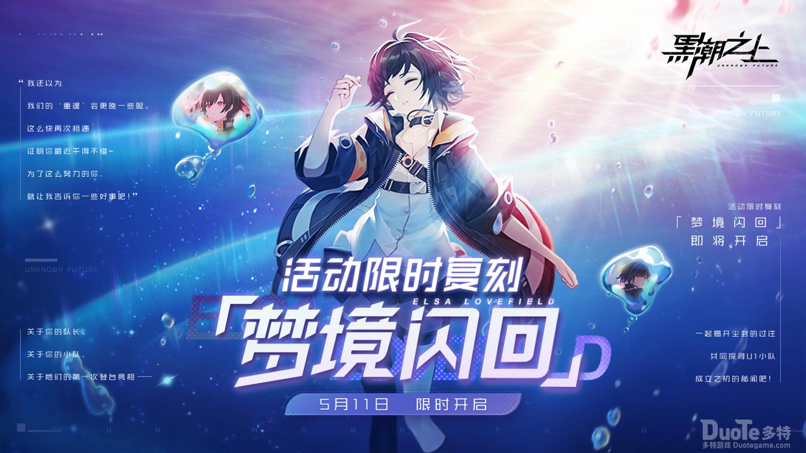 记忆闪回,梦境再临!5月11日至6月8日,都市异能战斗女团手游《黑潮之上》将惊喜重启特别玩法「梦境闪回」!按照各位接触者的反馈,本轮活动特别进行了难度调整!准时上线参与活动,更可赢取「艾尔莎绯阶藏品」、「祈愿券」等惊喜奖励,解锁艾尔莎更高战力!一起进入梦境彼端,回到旅途的起点,共同探寻U1小队成立之初的秘闻吧!
