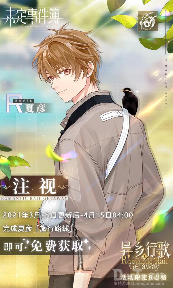 精彩活动剧情 多样限定福利3月25日,「异乡行歌·上篇」活动正式开启,精彩活动剧情、多样限定活动福利将同步解锁。2021年3月25日更新后-4月15日04:00期间,玩家可选择与陆景和或夏彦一起,开启浪漫的列车旅行。选择与夏彦同行,将前往广阔无垠的草原,携手调查钻石失踪疑案。选择与陆景和同行,将前往原始神秘的雨林,共同探寻传说中能治百病的“仙草”。