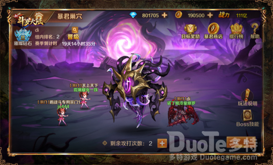 各宗门需齐心协力,对邪眼暴君造成大量伤害,方能让全宗门获得更高荣誉和更多奖励哦~