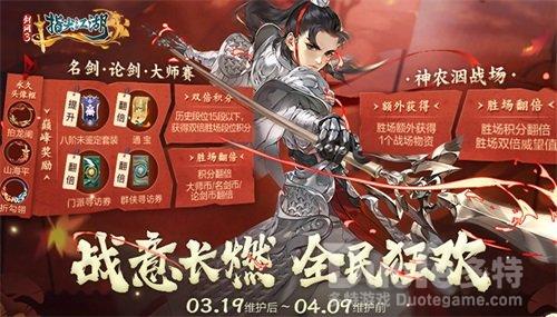 【战意长燃 全民狂欢】群英争锋山河动,天下英雄谁敌手。【江湖论剑】、【名剑大会】、【大师赛】、【神农洇战场】等竞技玩法收益大幅升级!通宝翻倍,八阶未鉴定套装掉概率up up up!