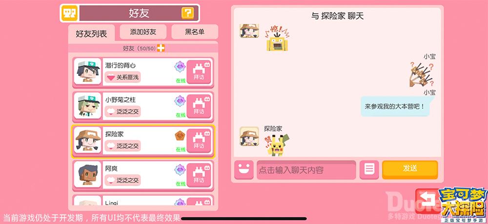 全新社交: 交互玩法惊喜翻倍在神秘广阔的方可乐岛上探险,认识一些志同道合的小伙伴可以为你的探险增添许多惊喜。《宝可梦大探险》中的“好友系统”让探险家们可以轻松结交好友,一起组成“探险小组”或是开启“好友协战”功能,共同探索方可乐岛的秘密。当好友的宝可梦前来营地拜访时,探险家还有机会收到惊喜礼物。此外,探险家还可以在世界频道聊天,结识全服探险家。