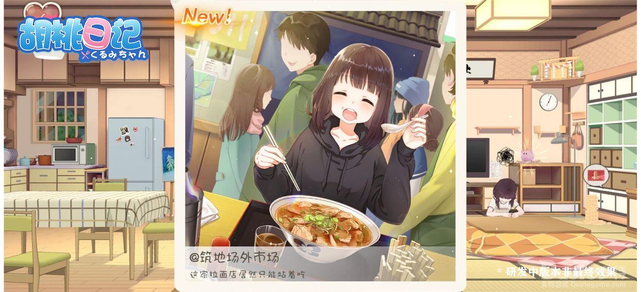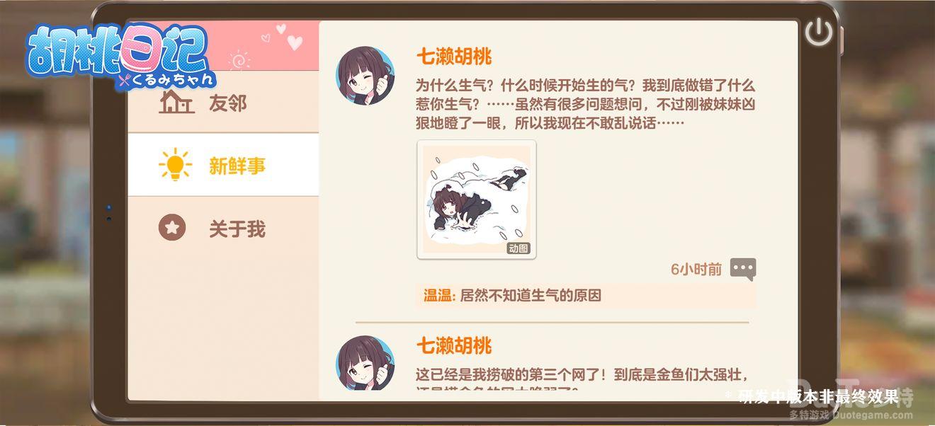 2021年4月16日,由巨人网络研发的休闲养成陪伴手游《胡桃日记》,全平台正式上线!七濑胡桃正是这款游戏的主角,在游戏里,胡桃可以二十四小时亲密陪伴大家,而玩家只需要照顾胡桃的饮食起居和衣食住行,就可以与这位时而沙雕,时而淑女的可爱女孩,近距离互动。