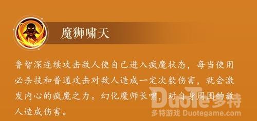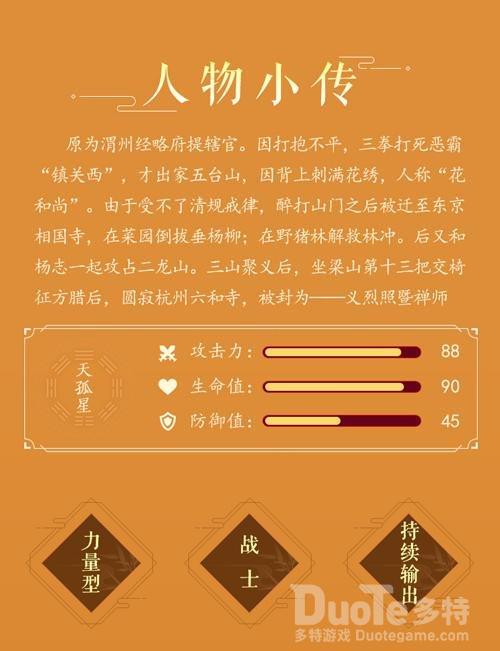 在游戏中鲁智深的设计也更体现了他的英雄本色,鲁智深属近战英雄,更适合做前排输出位英雄,如何能让鲁智深存活的更久,是阵容搭配的重点~