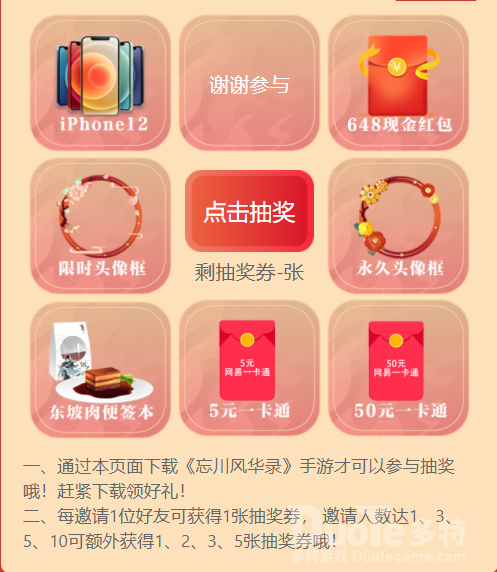 还有机会赢取648现金红包,iPhone12,网易一卡通,精美游戏周边!不仅如此,邀请多名好友参与预约活动,将额外获得抽奖券,高几率中奖,一卡通全网易游戏通用哦!