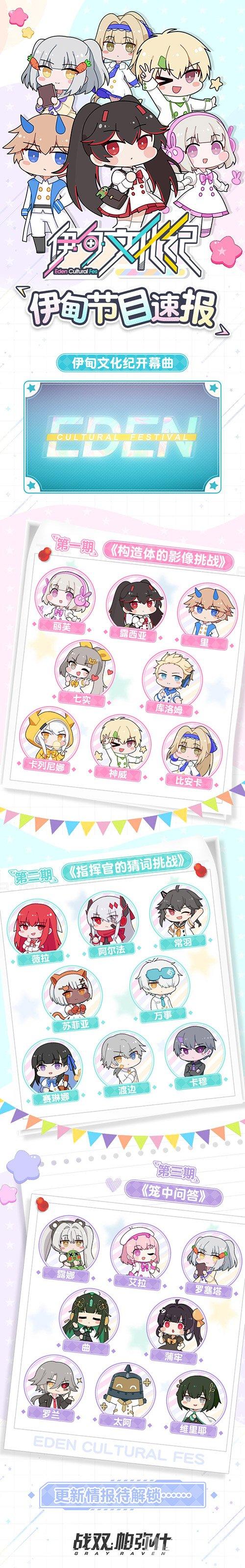 目前,经过了为期一周的第一场【开幕纪典】的纪典进程后,最后有12名角色在「伊甸文化纪」中得到晋升,他们分别是里、卡穆、库洛姆、神威、蒲牢、露娜、赛琳娜、曲、露西亚、七实、阿尔法和维里耶。在接下来的一周,他们将在【前日纪】继续继续迎接挑战!请玩家们继续大胆表白,为爱支援,提成他们的热度值吧!