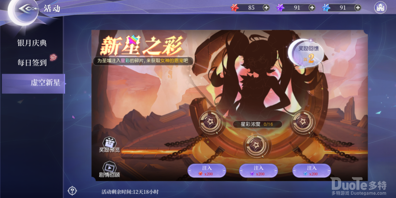 随着望月测试的开启,【虚空新星】活动正式登场。在活动期间,部分玩法会掉落【星彩碎片】,登月者们可以在活动页面的3个槽位为圣墟注入【星彩碎片】,获取女神的恩宠。女神将会根据星彩碎片的不同组合,赠予登月者们回馈奖励,每天前几次回馈奖励有翻倍效果。需要什么资源,就亲自探索对应的组合,向女神献上诚挚的心意吧!