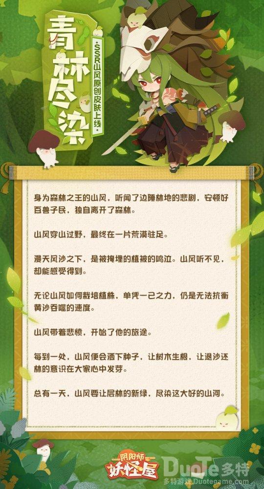 ●活动期间,「万木萌芽」礼包限时上架商店,购买礼包将获得SSR阶式神山风皮肤「青林尽染」、纪念称号「森之心」和「万木萌芽」活动专属公益证书。