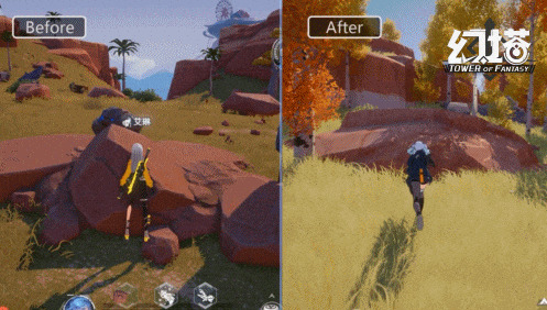此外,角色的各种运动相比以前,更加“贴近地形”了。在视频中能看出,角色在遇到岩石等小障碍时,能根据地形做出适当的动作,攀爬时的角色模型也与地形更为贴合。