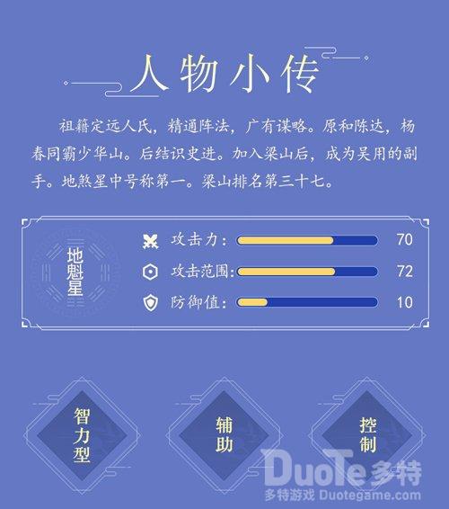而在游戏中,朱武虽是地煞,但也绝对值得培养。和在《水浒传》中的神机军师的定位相似,朱武是一名非常百搭的英雄,善用阵法来提供增益,并在长线战斗中有独特优势。搭配输出能力超群的英雄,朱武定能为他们保驾护航,过关斩将。