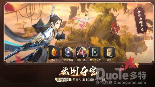 每周六、周日晚19:00~19:15将开启【云图夺宝】活动,少侠可前往【云海宝藏山】一决高下!地图中将会随机刷出宝箱,少侠需使用轻功飞跃至各个平台开启宝箱,宝箱内含【鬼工图纸·九阶】、【鬼工图纸·八阶】、【七级五行石】等丰厚奖励。