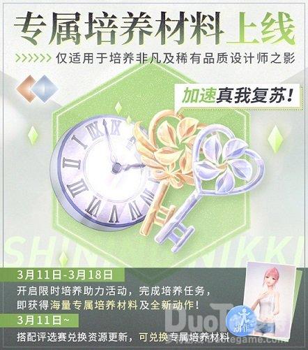 此次游戏更新后至3月18日,玩家完成培养任务,即可领取专属培养材料和任务积分,累计积分达指定要求还可领取粉钻、摆拍动作“眷顾流年”等奖励。