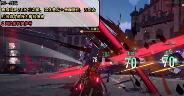 战技,烧血增伤+强化普攻。释放后,消耗刃生命值上限的30%,使行动立即提前100%。获得持续3回合的状态,获得全方面的伤害增幅,且期间普通攻击变为伤害更高的扩散伤害。