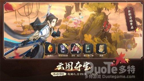 每周六、周日晚19:00~19:15将开启【云图夺宝】活动,少侠可前往【云海宝藏山】一决高下!地图中将会随机刷出宝箱,少侠需使用轻功飞跃至各个平台开启宝箱,宝箱内含【鬼工图纸·九阶】、【鬼工图纸·八阶】、【七级五行石】等丰厚奖励。