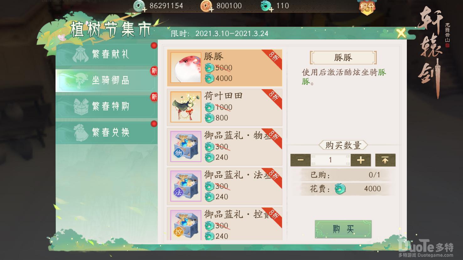 【琳琅满目,植树节集市春日献礼】植树节集市限时开放,超值折扣惊喜来袭!使用玉帛即可兑换坐骑豚豚及鞍座荷叶田田、开箱御品蓝礼宝盒、获取详慧之书、神木之精等稀有养成材料!