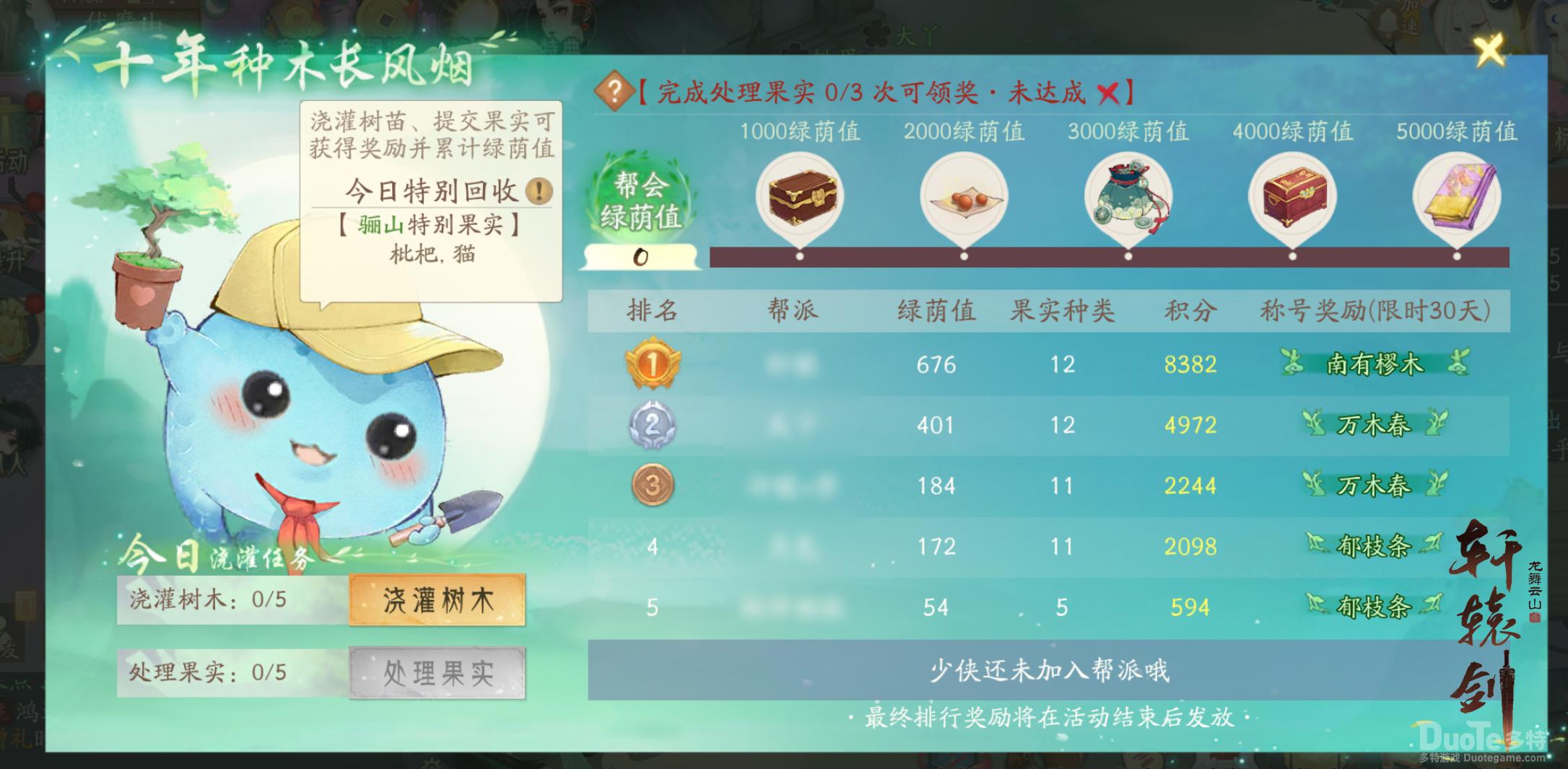 本次活动还设有丰富的帮派奖励,各位少侠不容错过!每处理一件果实,可累计一定的帮派绿荫值,当帮派绿荫值达一定数值时,帮派玩家可领取相应奖励。活动结束后,根据排行榜给帮派全体成员发放活动称谓奖励。