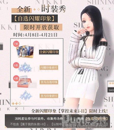 此次游戏更新后至4月21日,全新COLOURS时装秀活动开启,自选闪耀印象限时开放获取。玩家参加时装秀,收集秀场券,即可在“秀场兑换处”换取7折“自选闪耀印象”、6折“闪耀印象碎片”、4折“自选非凡印象”、“非凡印象碎片”和冰凝之心等道具。本期新增闪耀印象“掌控未来Ⅰ”、“掌控未来Ⅱ”,仅能通过时装秀活动获取。