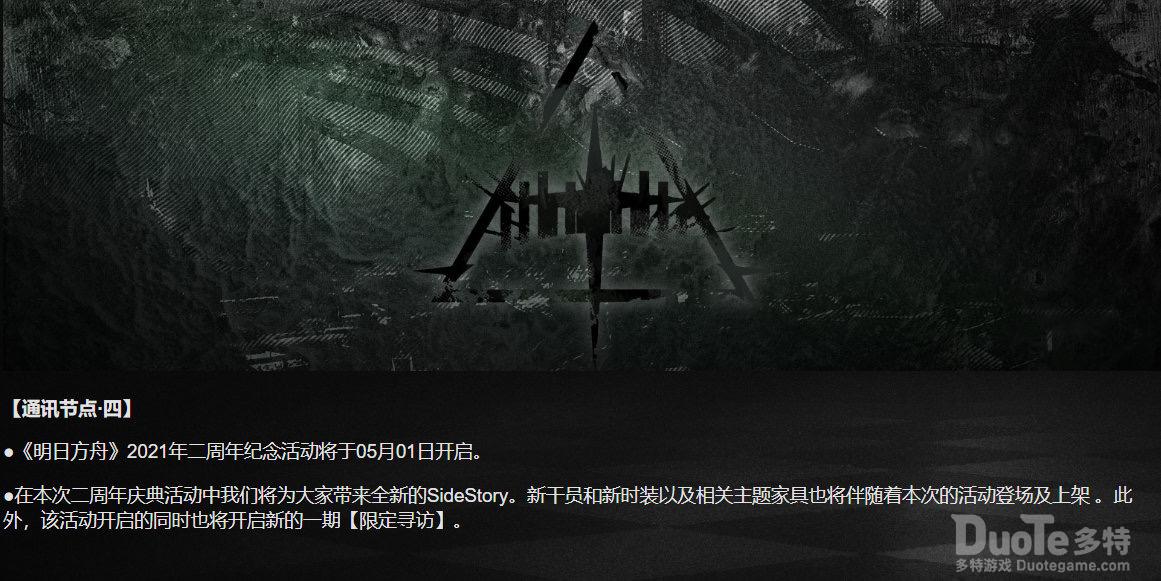 《明日方舟》二周年庆典直播计划将于04月24日进行(直播开启具体时间请关注后续官方公告)。
