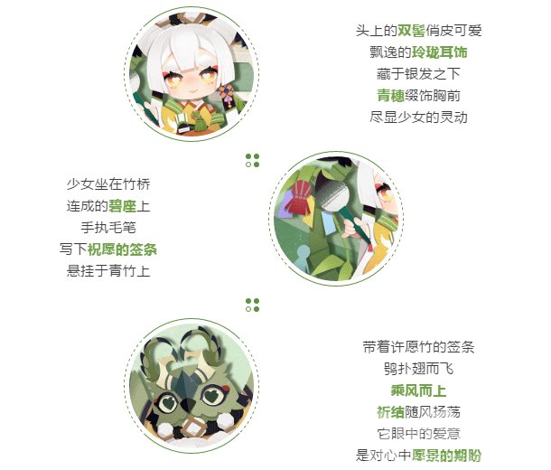 竹林深处里似乎传来了鸣叫声和欢笑声;仔细聆听,声音逐渐明朗倏而,双翼平展的身影从竹林中掠了出来!原来是鸮正带着换上新装的薰四处玩耍,青竹上的祈愿签条也因薰的嬉戏打闹而摇晃飘动着!
