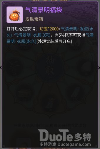 待抽取8次后,还可获得气清景明福袋,必得永久限定发型以及限定服装体验卡,有概率免费获得永久服装!