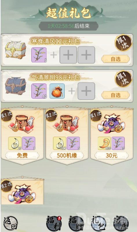 本次清明上架了两款“自选礼包”,仙友们可从奖励道具池中自选需要购买的道具,每个阶段的仙友都可根据需要购买超值礼包。购买气清景明超值礼包后必得气清景明·衣服(永久)哦!